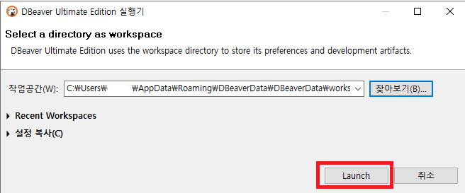 찾아보기 클릭 > DBeaverData 경로 지정