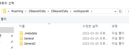 ※ 아래 캡쳐에서 General, General2는 DBeaver에서 실제 표시되는 디렉토리로 해당 디렉토리의 바로 한단계 상위 디렉토리까지 지정해주면 됨. 즉, 아래 캡쳐 예시에서는 workspace6까지 지정을 해주면된다.