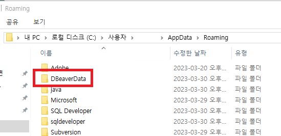 그럼 DBeaver가 설치된 PC라면 아래와 같이 DBeaverData 디렉토리를 확인할 수 있다. 통째로 복사하자.